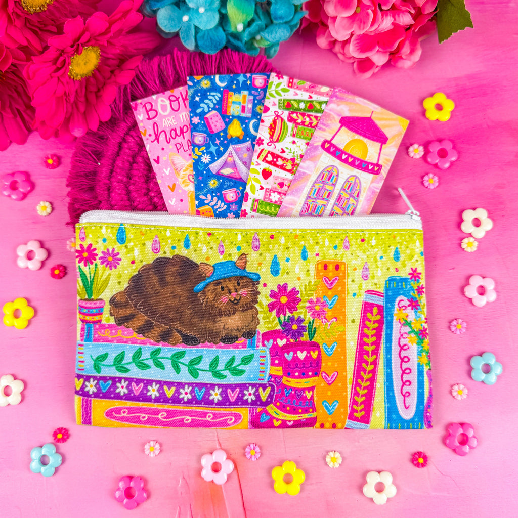 Rainy Day Kitty Bookshelf Bookmark/Accessory Pouch
