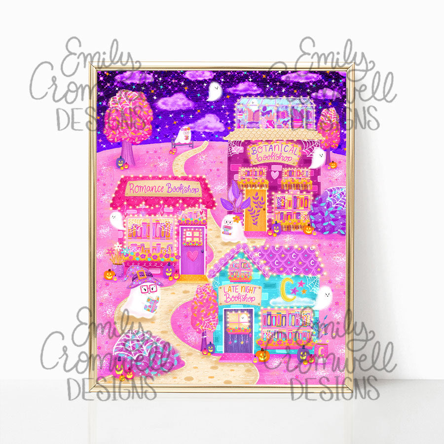 Halloween at Bookshop Avenue Art Print