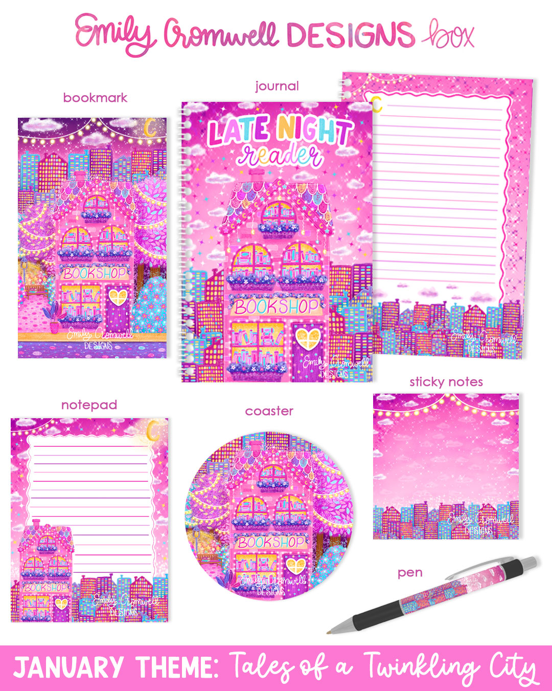 Treat yourself with the Emily Cromwell Designs Box! Each quarter, you'll get a subscription box full of exclusive bookish merch that will make any reader swoon with delight. Receive everything you need to express your love of reading in style!