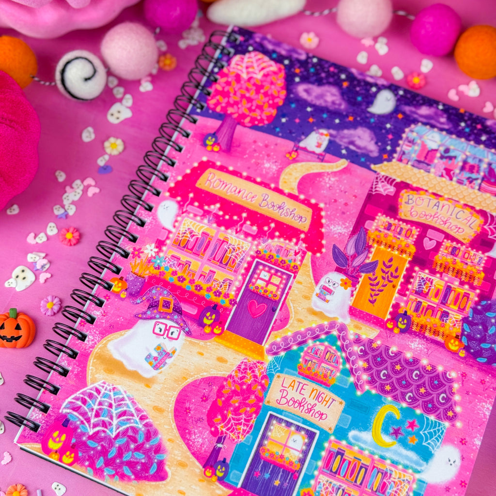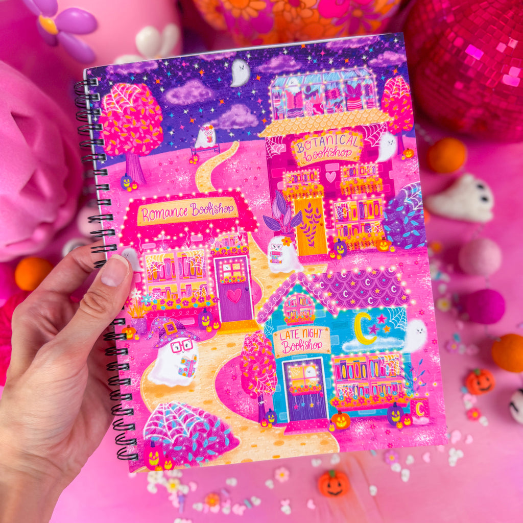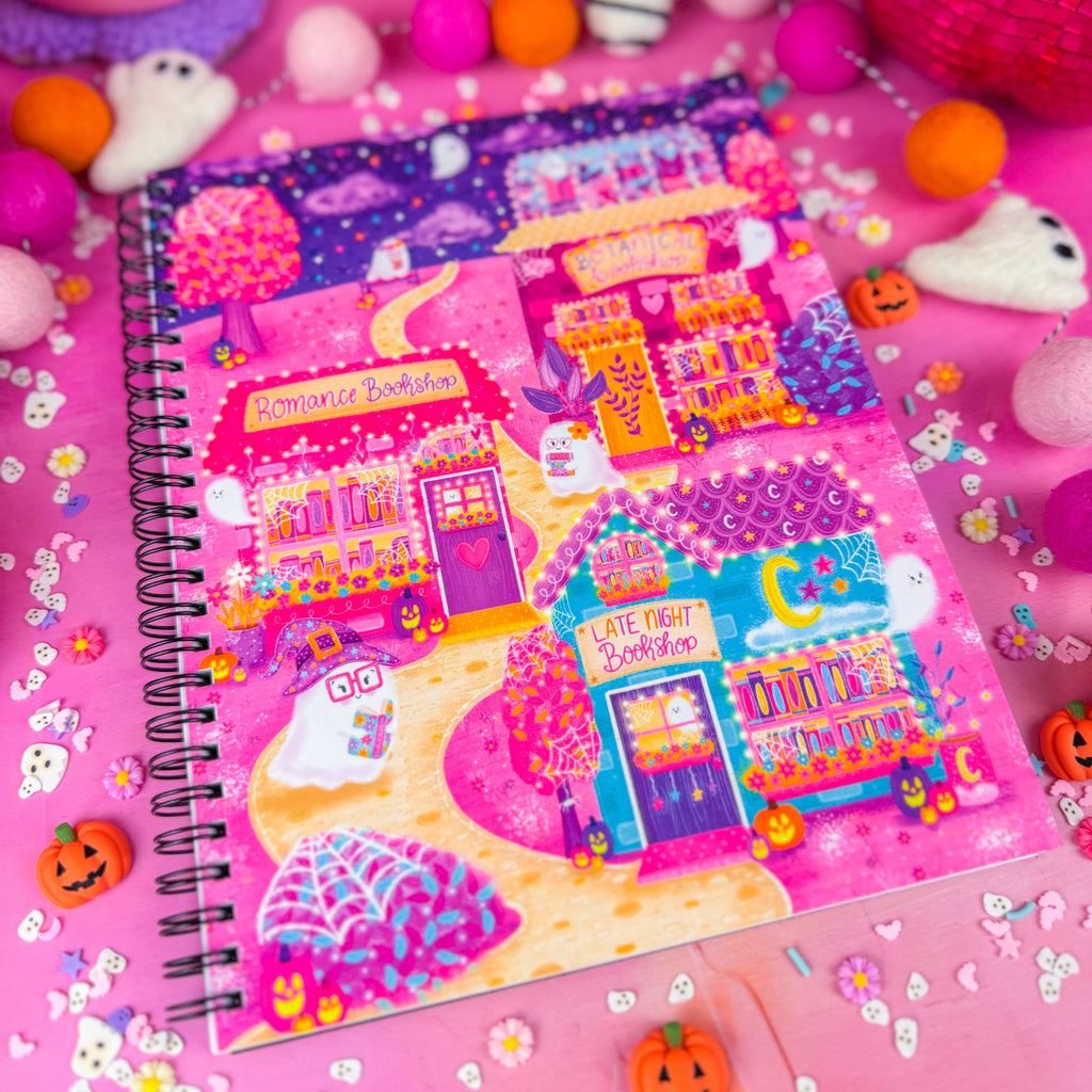 Celebrate spooky season with the Halloween at Bookshop Avenue Lined Notebook. Sized at 7" x 9", this dreamy notebook invites you to write down spooky tales, magical ideas, or your Halloween plans. Perfect for book lovers who enjoy a touch of spooky season and whimsy in their notes!