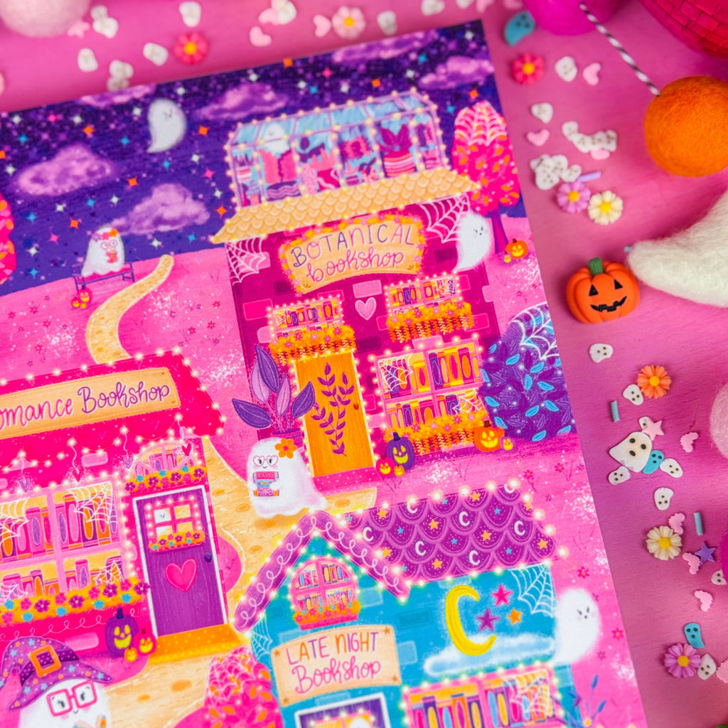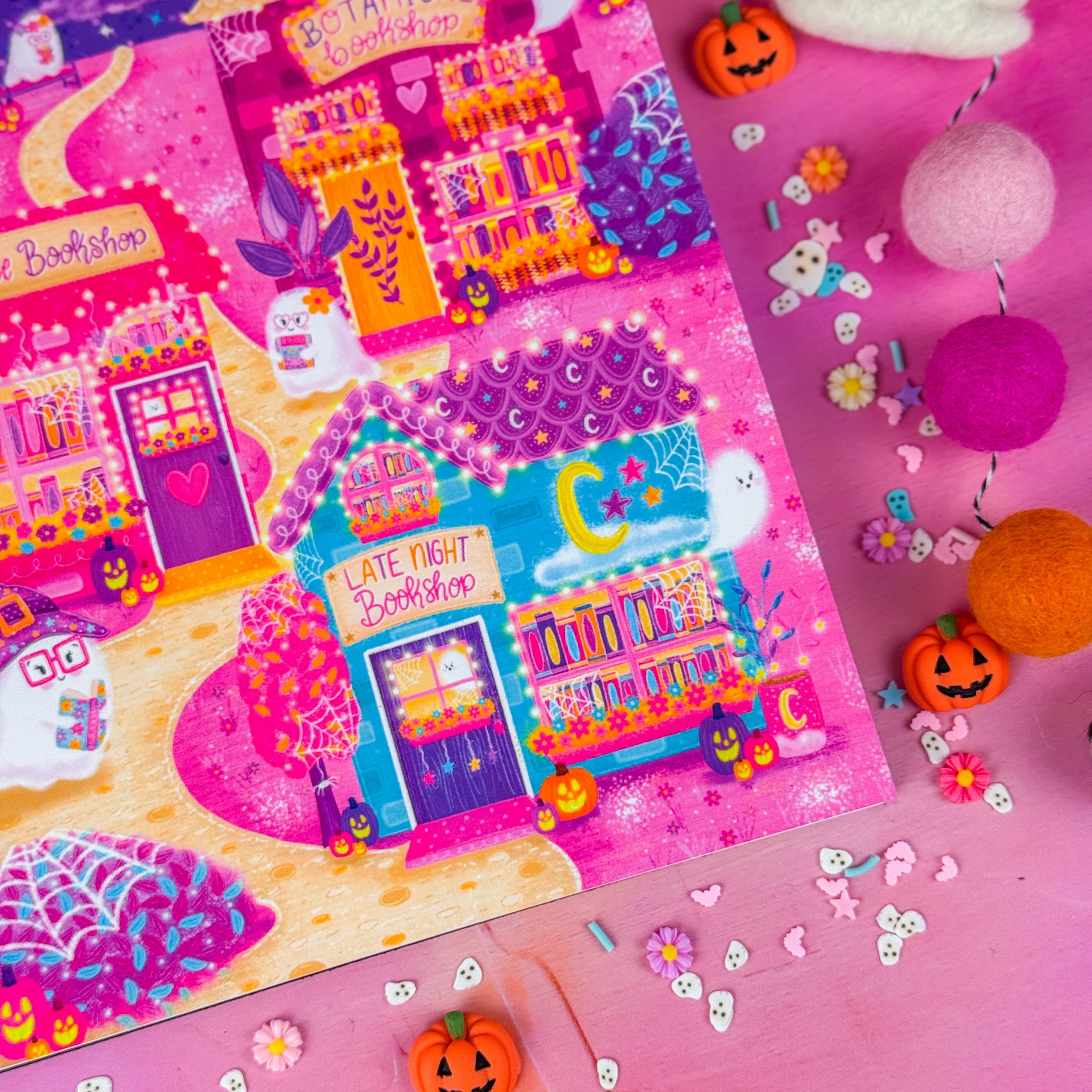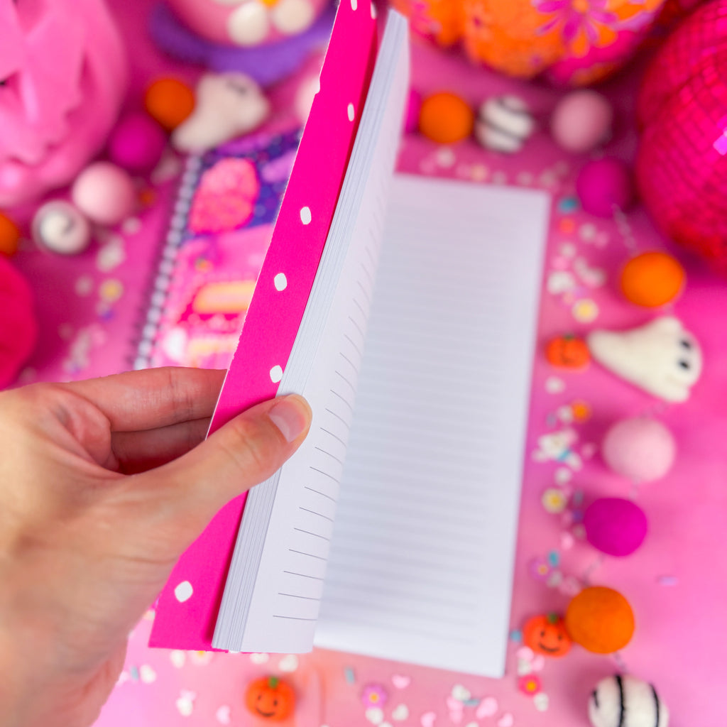 Celebrate spooky season with the Halloween at Bookshop Avenue Lined Notebook. Sized at 7" x 9", this dreamy notebook invites you to write down spooky tales, magical ideas, or your Halloween plans. Perfect for book lovers who enjoy a touch of spooky season and whimsy in their notes!