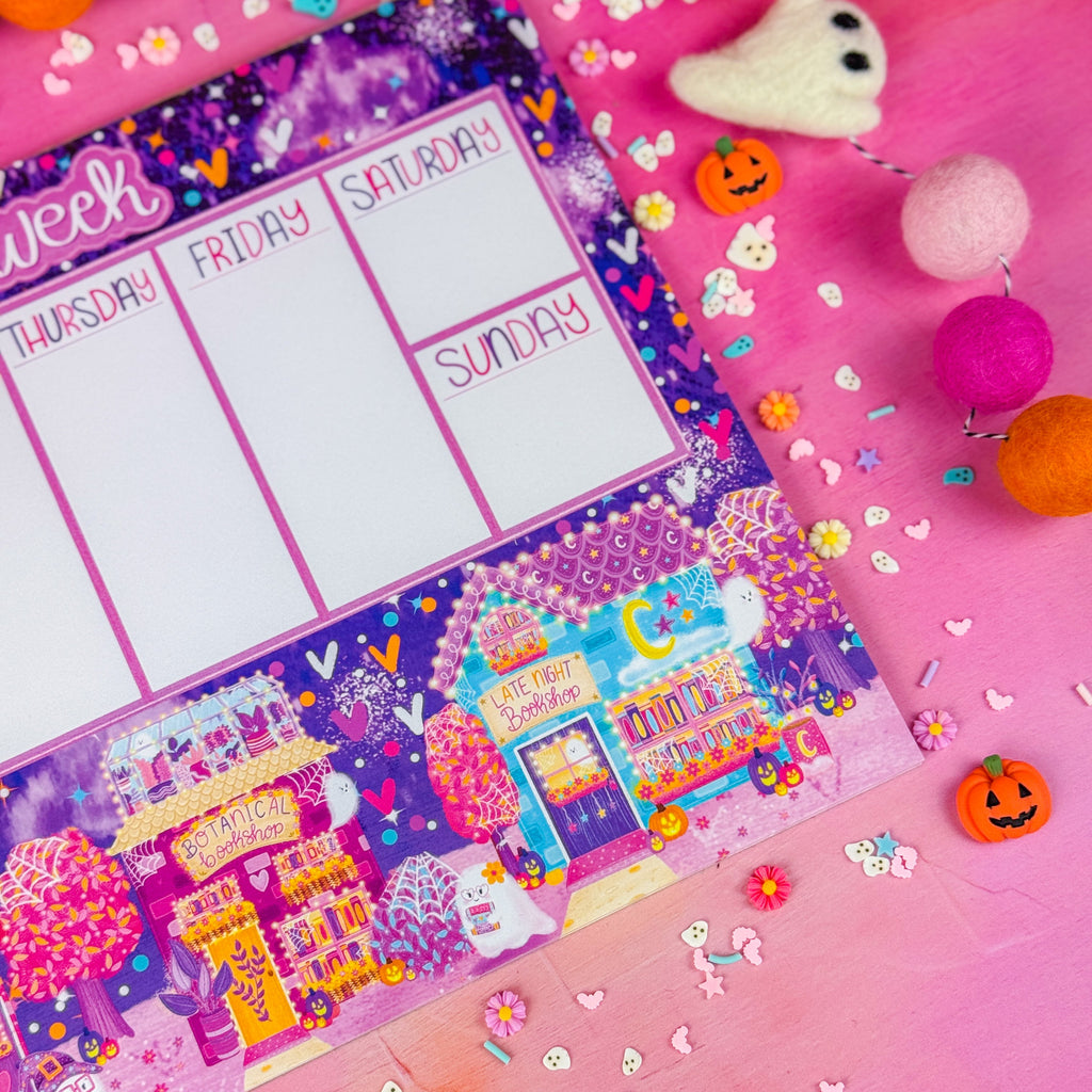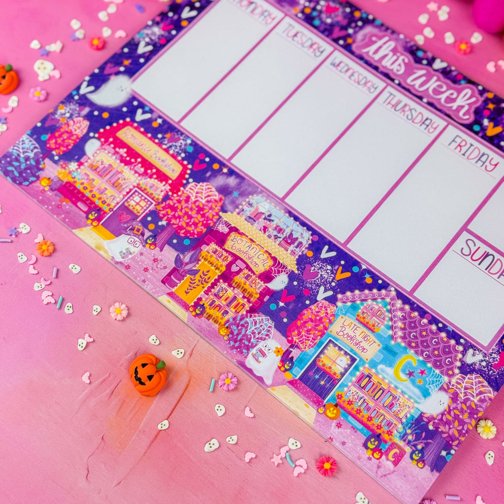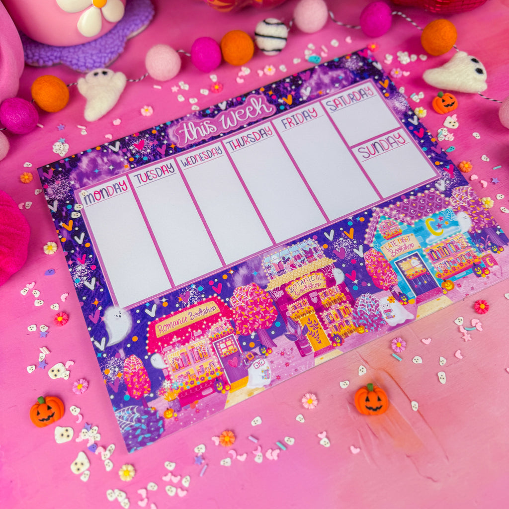 Stay organized with a spooky twist using the Halloween at Bookshop Avenue Weekly Planner Notepad. Perfect for jotting down your weekly tasks and bookish to-do's, its whimsical Halloween theme adds a fun, festive vibe to your planning. Whether you're scheduling appointments or tracking books to read, this notepad inspires creativity and keeps your week on track in a cute spooky style.