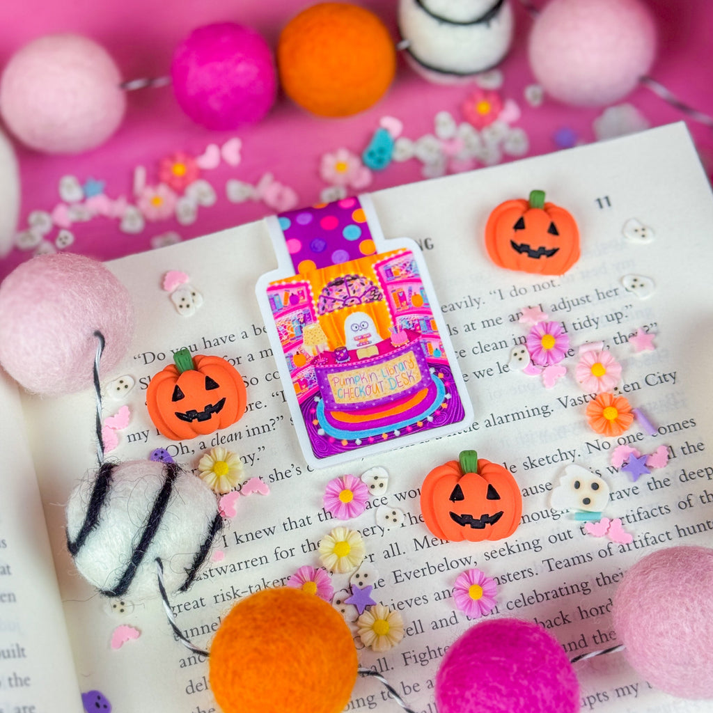 Keep your pages cozy and secure with the Pumpkin Library Checkout Desk Magnetic Bookmark! This charming, seasonal bookmark clamps gently onto your favorite reads, adding a dash of Halloween fun while making sure you never lose your spot.