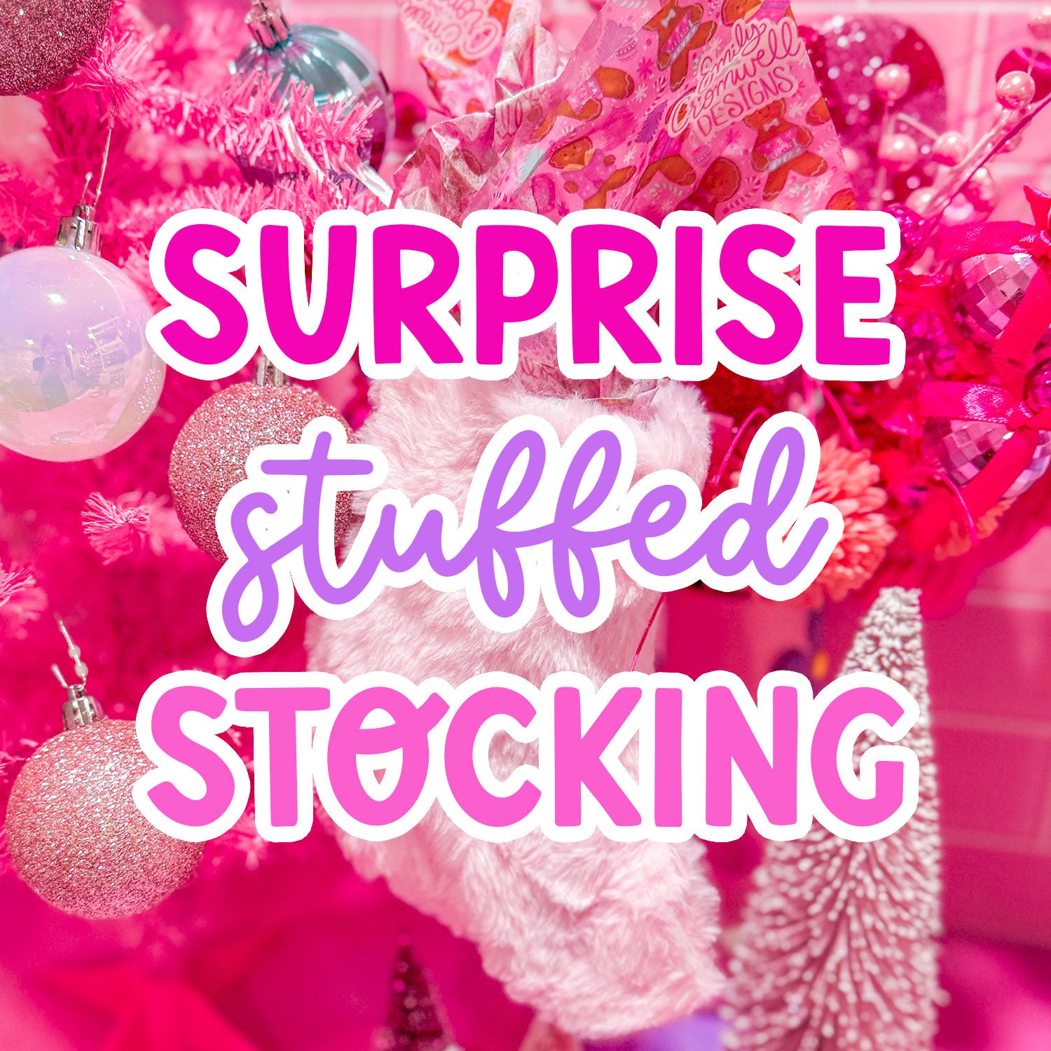 This listing is for one surprise stuffed stocking featuring a surprise assortment of products form our shop! Each stocking has 1 sticky notes, 3 laminated bookmarks and 3 vinyl stickers and a pen. All items are holiday designs.